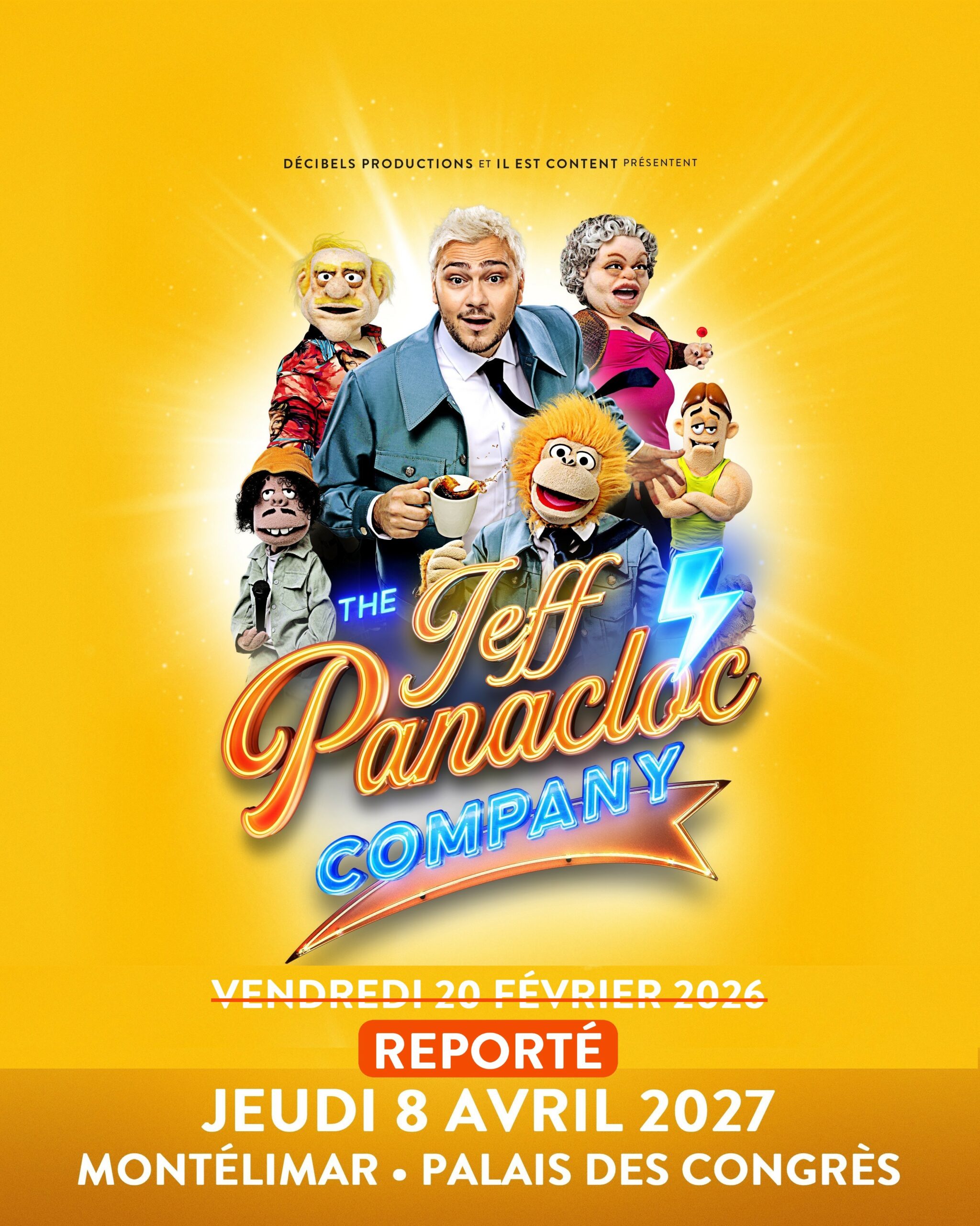 Pour des raisons techniques, la représentation de Jeff Panacloc prévue au Palais des Congrès de Montélimar le vendredi 20 février 2026 est reportée au jeudi 8 avril 2027. Vos billets restent valables pour cette nouvelle séanceSi vous ne pouvez assister au spectacle reporté, nous vous invitons à vous rapprocher de votre point de vente pour demander un remboursement.Merci pour votre compréhension